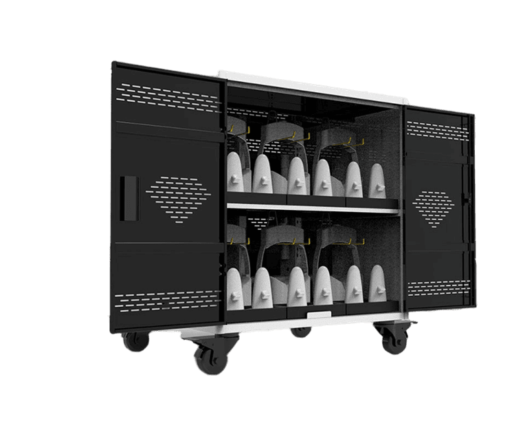 The Power Cart provides centralized charging, ventilation, and secure storage—ensuring clean headsets stay clean between sessions. The Cleanbox CX1 sits directly on top of the 12-device cart, enabling rapid disinfection between users. Using proprietary UV-C LED engineering, the CX1 delivers 99.999% disinfection in one minute (99.99% in 30 seconds) without chemicals, heat, liquids, or consumables, and is safe
